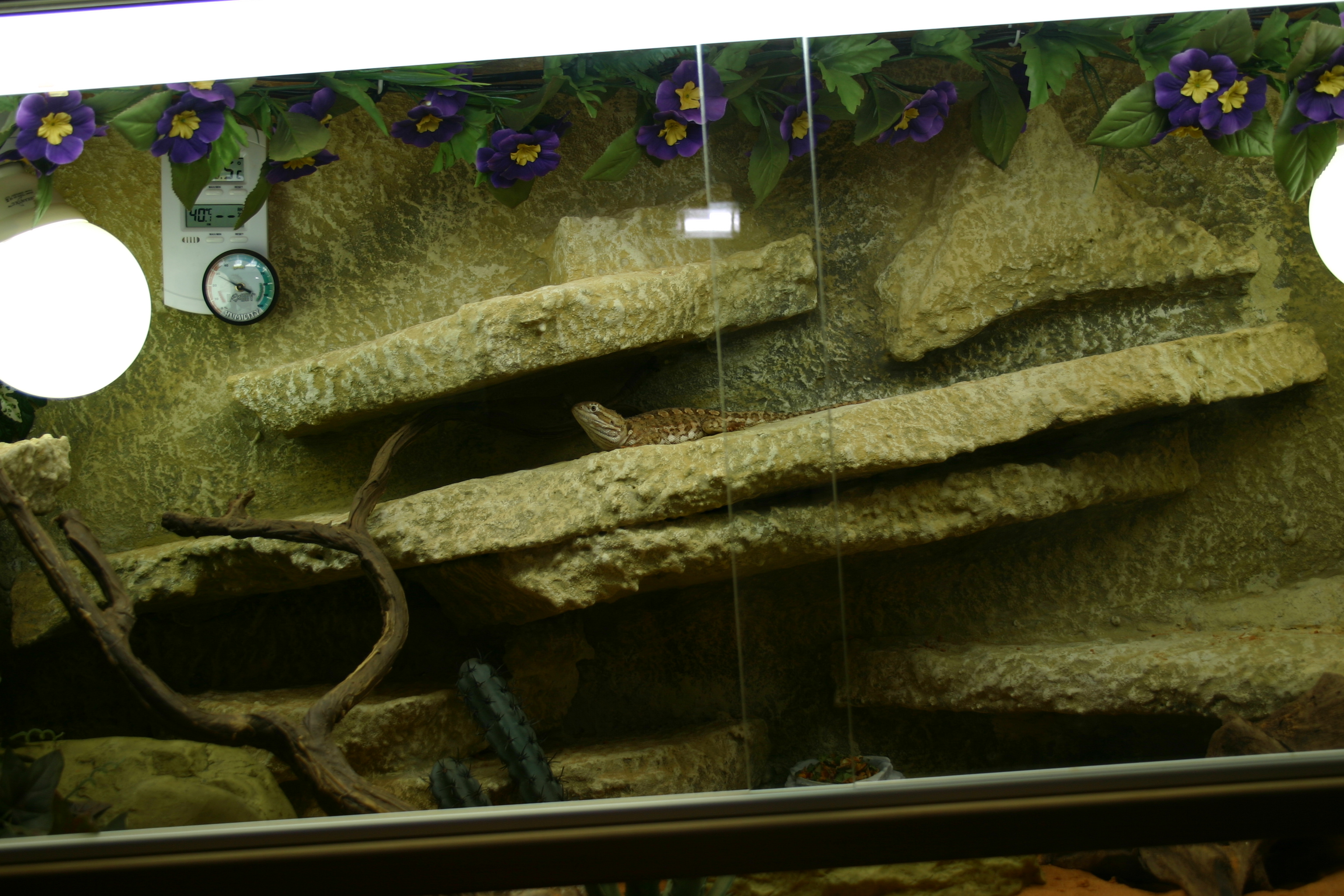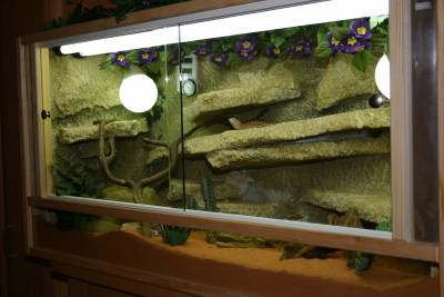 Die Breite und Tiefe des Terrariums kann etwas kleiner ausfallen, falls durch eine entsprechende Felslandschaft, Felsvorsprünge und viele Klettermöglichkeiten ein Ausgleich geschaffen wird.